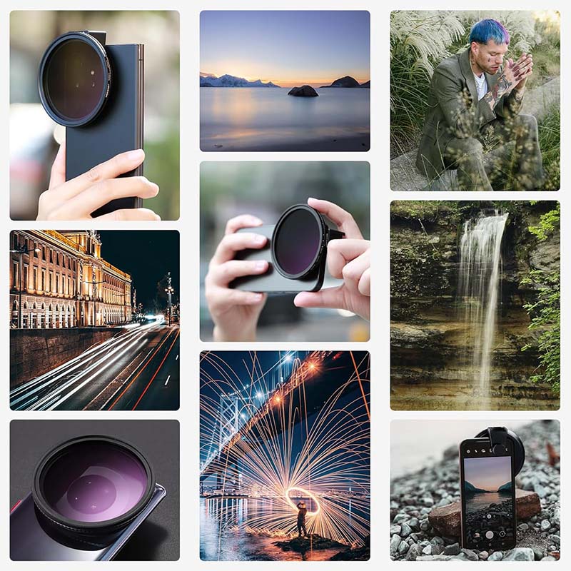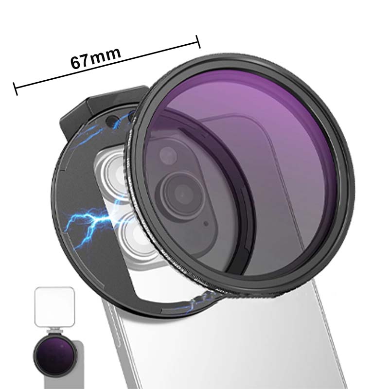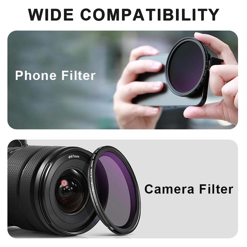 HIGH COMPATIBILITY WITH 67MM THREADED FILTER - The 67mm phone lens clip fits any filter with 67mm thread, including CPL polarizing filters, UV filters, as well as effect filters like GND, starburst, black diffusion, blue/gold streak, and more DSLR filters (compatible with K&F filters). The included 67mm Variable ND filter can also fit a camera lens.
