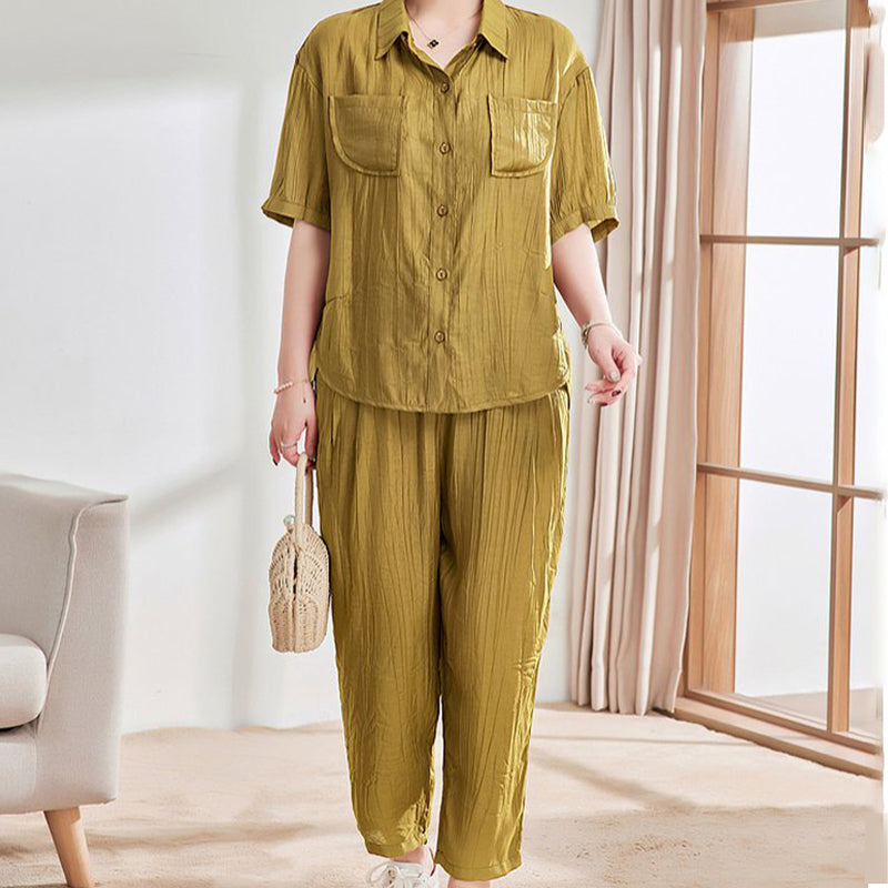 Type: Casual Solid Color Short Sleeve Shirt & Ankle Pants 2 Piece Set
