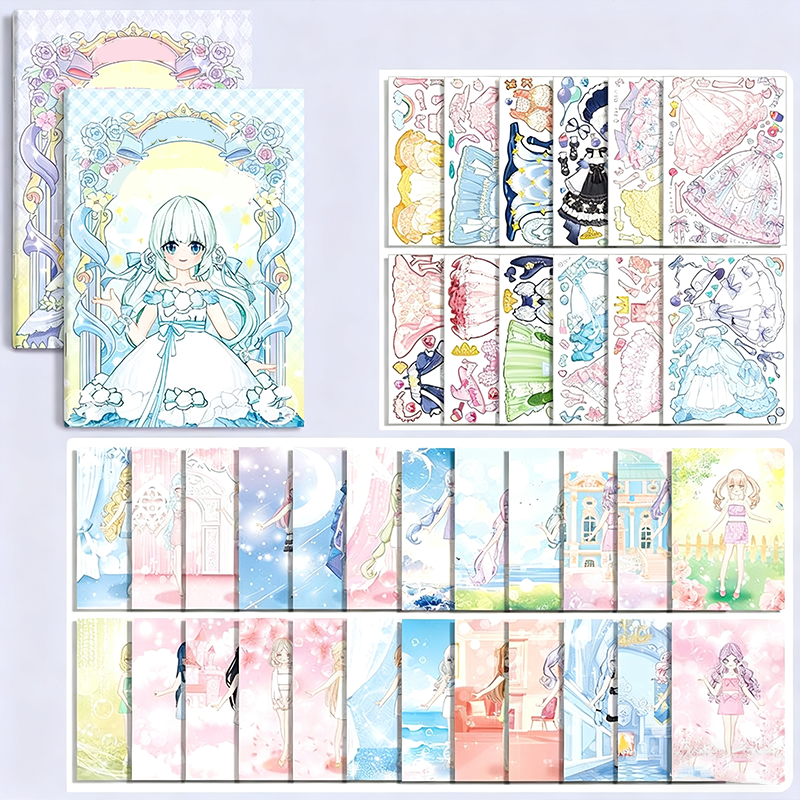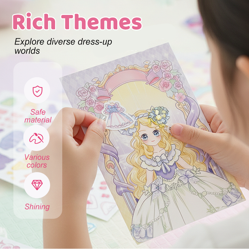 CREATIVE EXPRESSION – This dress-up sticker set allows girls to explore their inner creativity with abundant outfit themes and delightful character designs. The charming illustrations provide a visually inspiring experience that brings every creation to life.