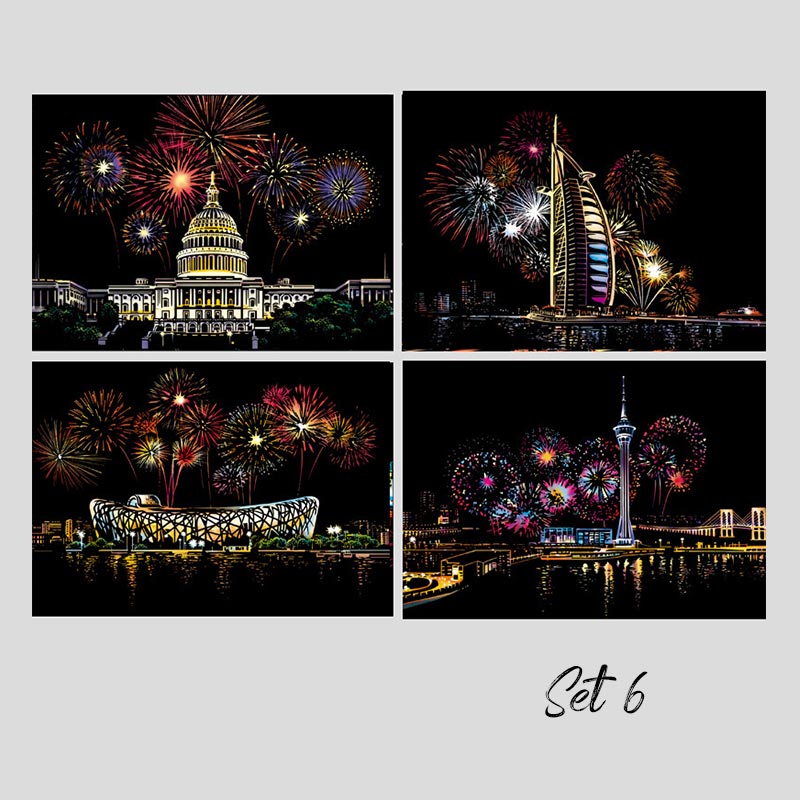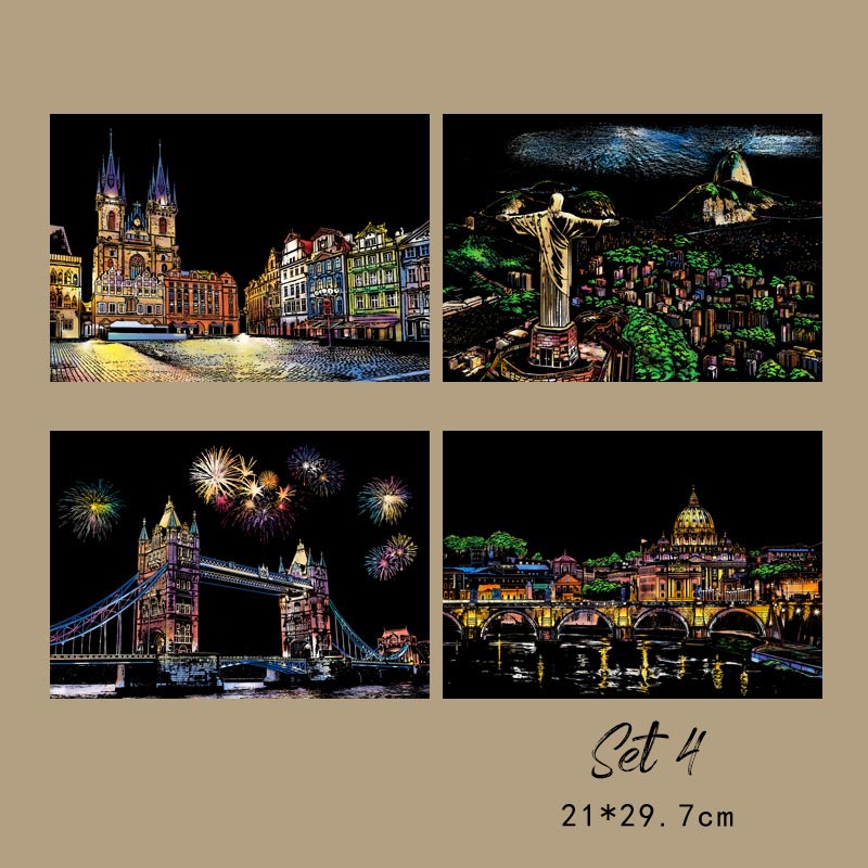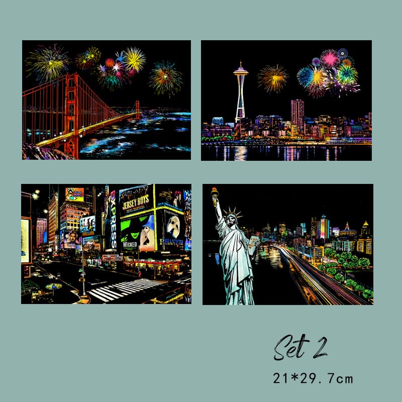 FUN & CREATIVE DIY ART EXPERIENCE: This set includes 4 beautifully designed scenes, offering a fun and relaxing creative activity. Unleash your inner artist as you reveal beautiful cityscapes by scratching off the dark coating.