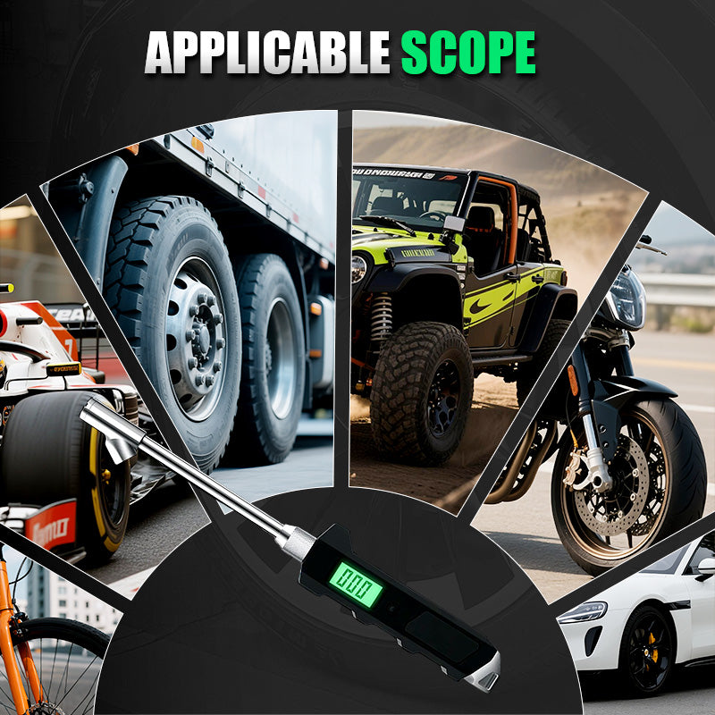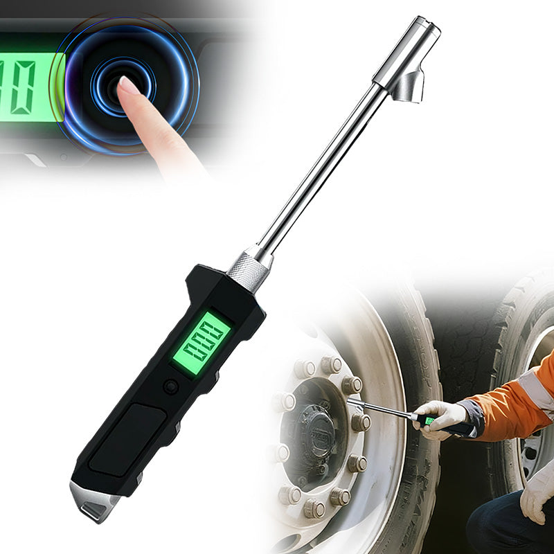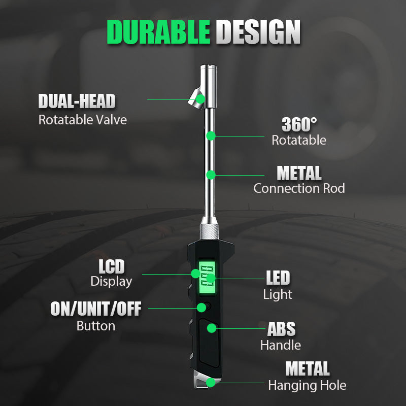 DUAL AIR NOZZLES – Equipped with dual nozzles that rotate 360° for easy operation and precise measurement from any angle. Designed specifically for RVs and trucks to maintain correct tire pressure, helping reduce tire wear and extend tire life.
