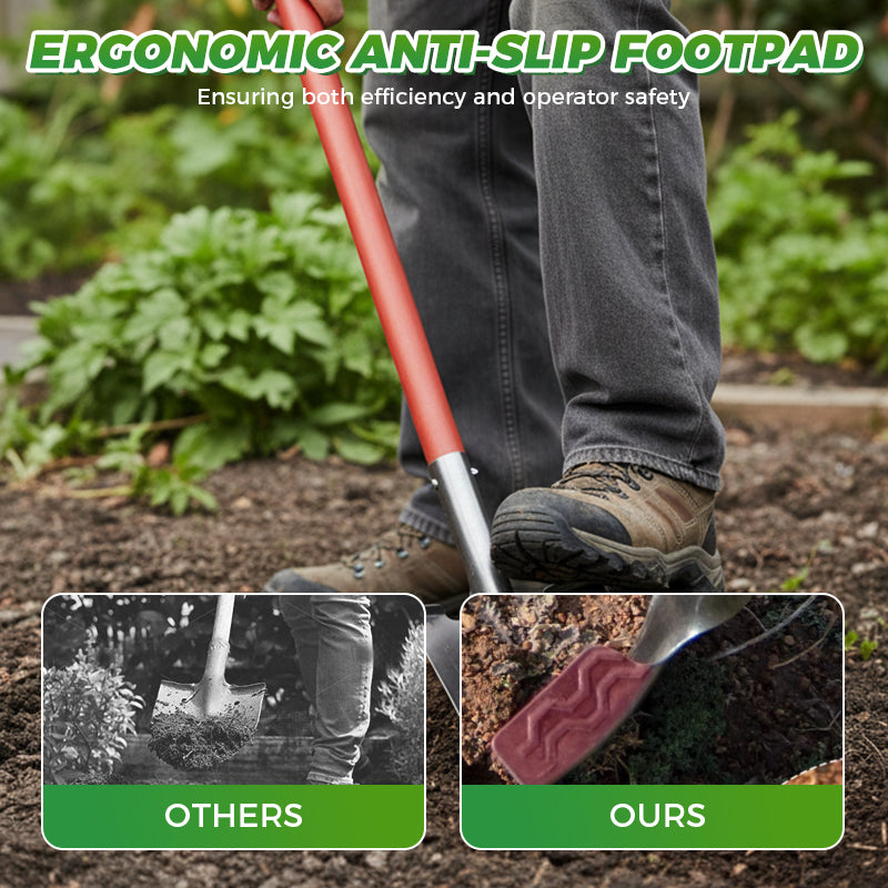 ERGONOMIC ANTI-SLIP FOOTPAD: Equipped with a widened foot platform and textured anti-slip surface for secure footing. Allows users to apply full body weight safely and effectively, increasing driving force into the ground while minimizing the risk of slipping, ensuring both efficiency and operator safety.