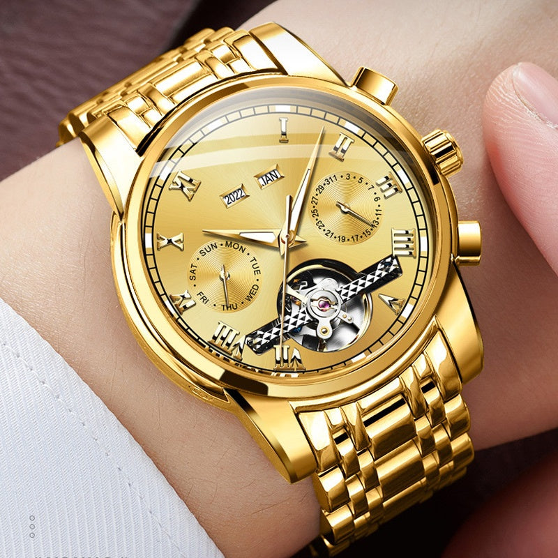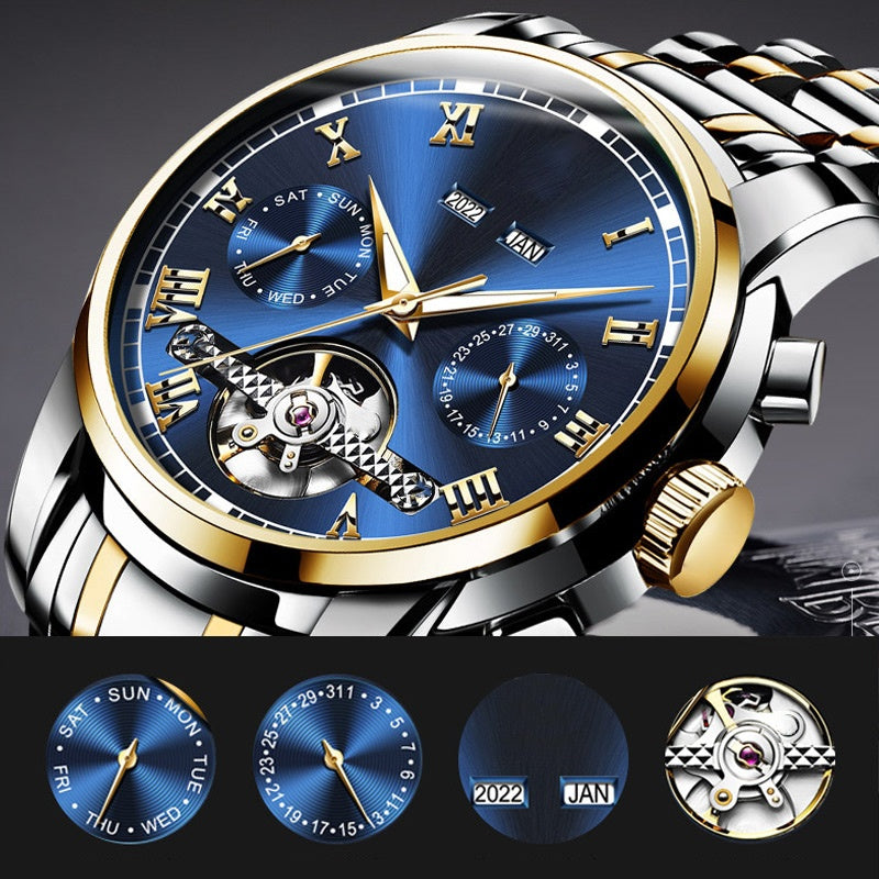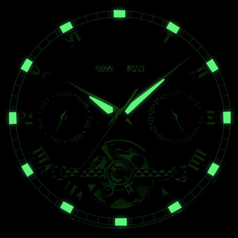 SKELETON DIAL: The openwork skeleton design showcases the intricate mechanics, offering a refined, luxurious visual. The crown seamlessly integrates with month and date buttons—both functional and aesthetically refined.