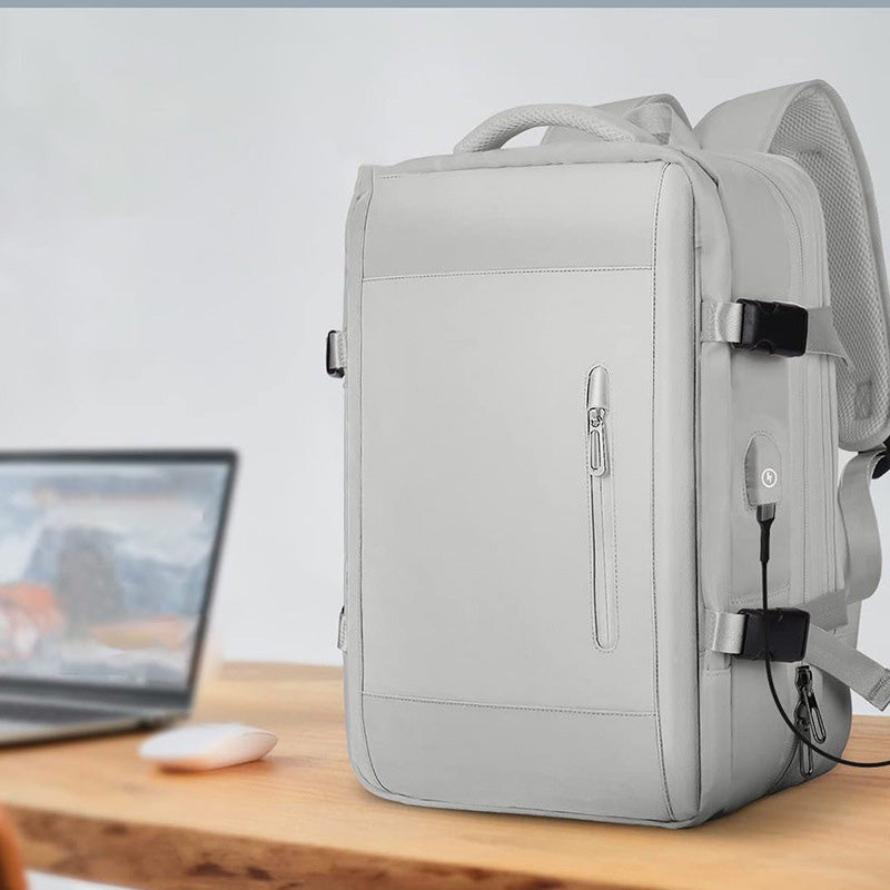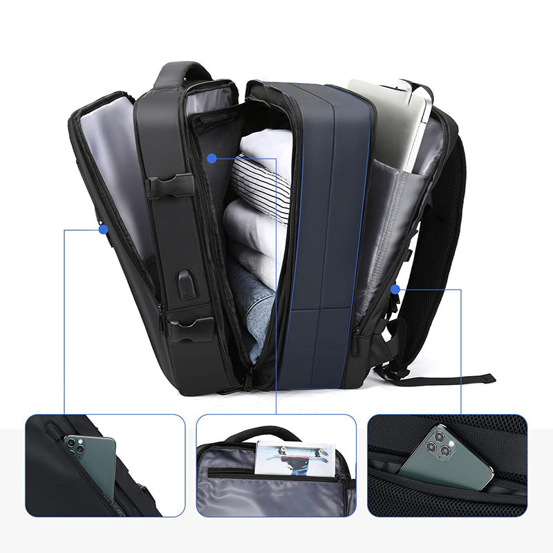 The large capacity business backpack is the perfect companion for your daily activities! With its versatile and spacious design, this backpack allows you to carry everything you need in an organized and secure manner. It features multiple compartments, including an anti-theft pocket, a zippered front pocket, a mesh pocket, a USB port pocket, a multifunctional main compartment, a laptop layer, and a main compartment for clothes. Additionally, its padded and breathable back panel provides comfort throughout the day. Don't worry about capacity, this backpack has plenty of space!