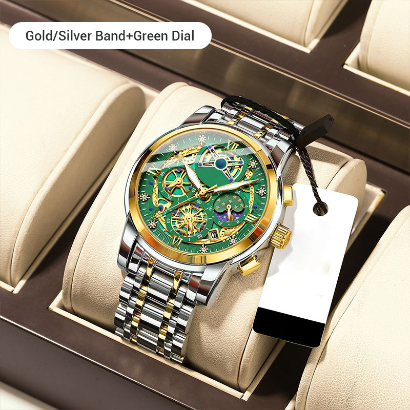 VERSATILE PRACTICAL FUNCTIONS - Features dual 60-minute/60-second chronograph sub-dials, 24-hour moon phase display, and a date window. Side-mounted controls offer intuitive operation, delivering reliable timekeeping for business, sports, and daily wear.