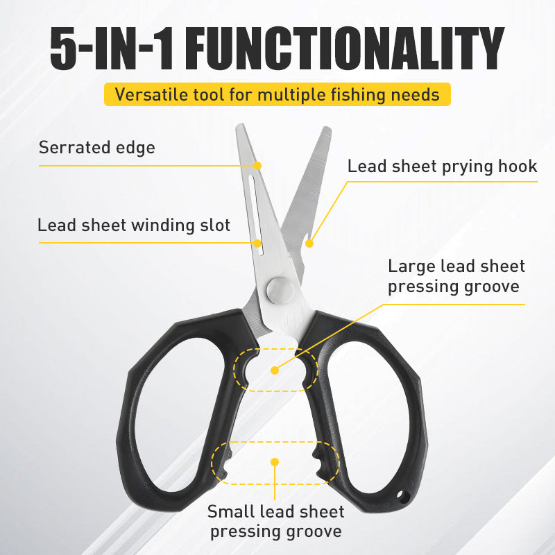 5-IN-1 FUNCTIONALITY - These multi-function fishing scissors offer five tools in one compact design, perfect for cutting hard lead sheet, handling PE lines, and working with lead core materials. A must-have tool for any angler.