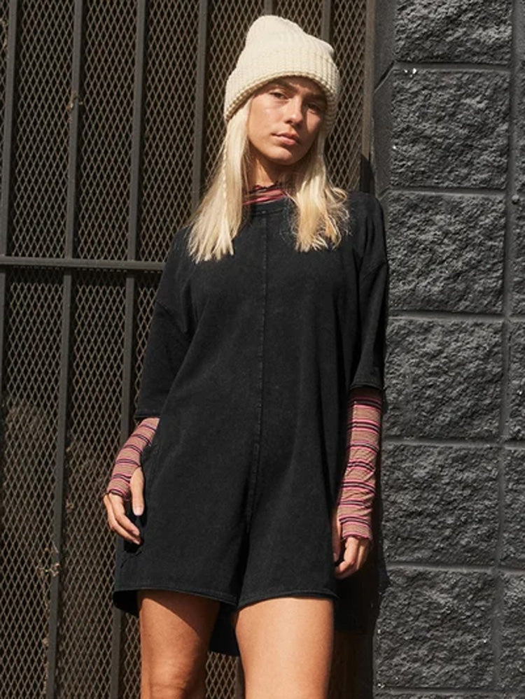 With its relaxed fit and short length, this romper is both trendy and easy to wear. The stretchy fabric allows for freedom of movement, while the rounded neckline accents add a touch of sophistication. The front 2 pockets, V-shaped back, and dropped sleeves give it a unique, edgy look.