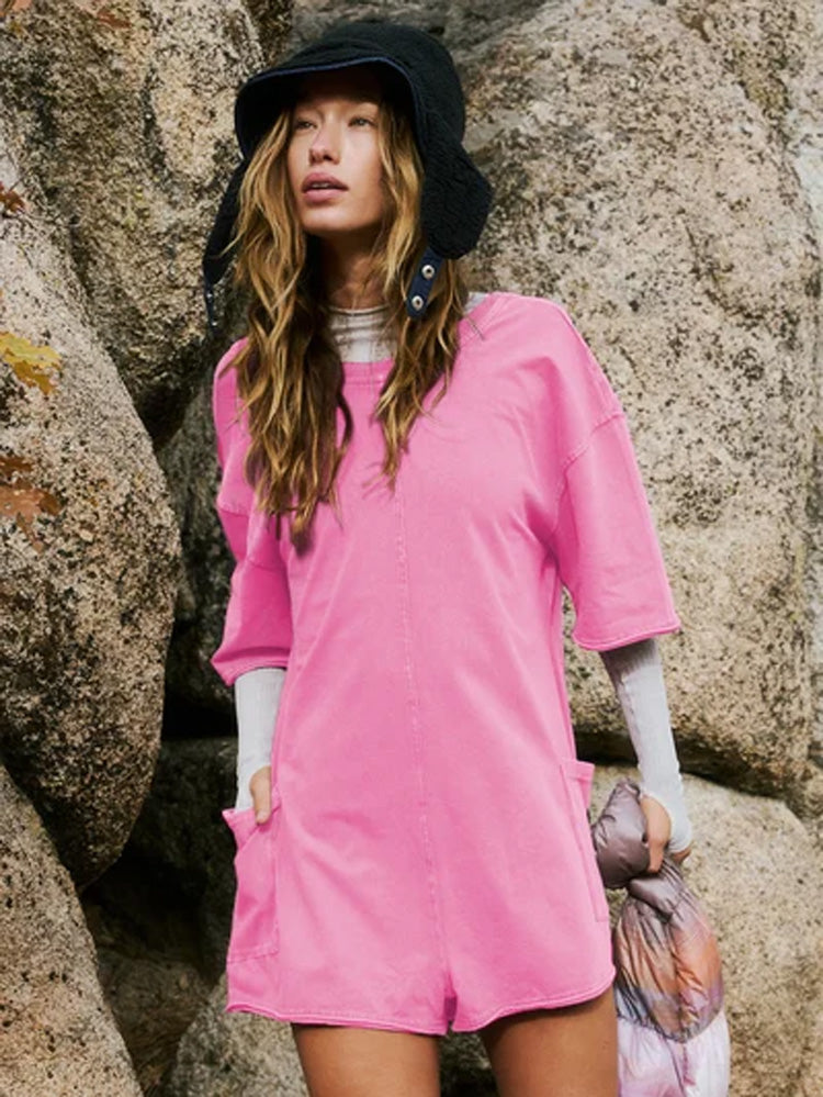 Introducing the Oversized T-shirt V-shaped Back Romper, the perfect blend of comfort and style. This romper is designed with extra roominess and made from a super soft fabric, ensuring all-day comfort.