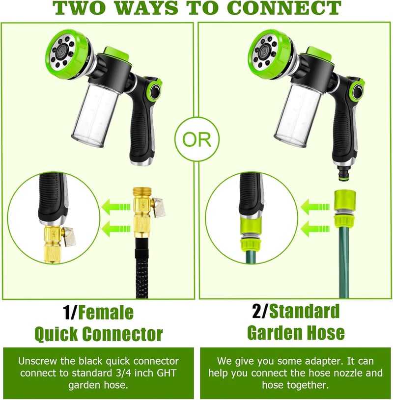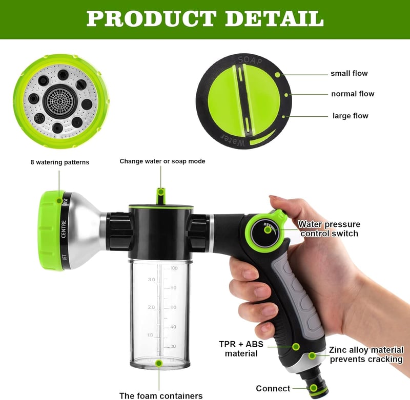 The foam gun has 8 types of spouts ,spin- click spray selector different settings ( rinse, stream, flat, center, jet, shower, mist and cone) which can spout water in 8 patterns for different uses, spray nozzle for garden hose fulfill your different needs. Best for Watering Plants, Lawn, Patio, and Washing Car, Showering Pets.