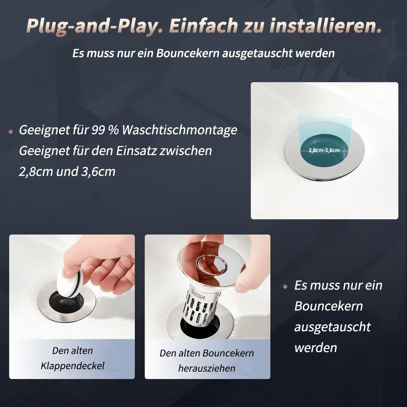 Unlike traditional drains with push buttons, this pop-up sink drain strainer features a clog-resistant sieve basket inside that neatly catches hair and prevents drain blockages. Jewelry, rings, dirt, and other items won't get into the drainpipe.