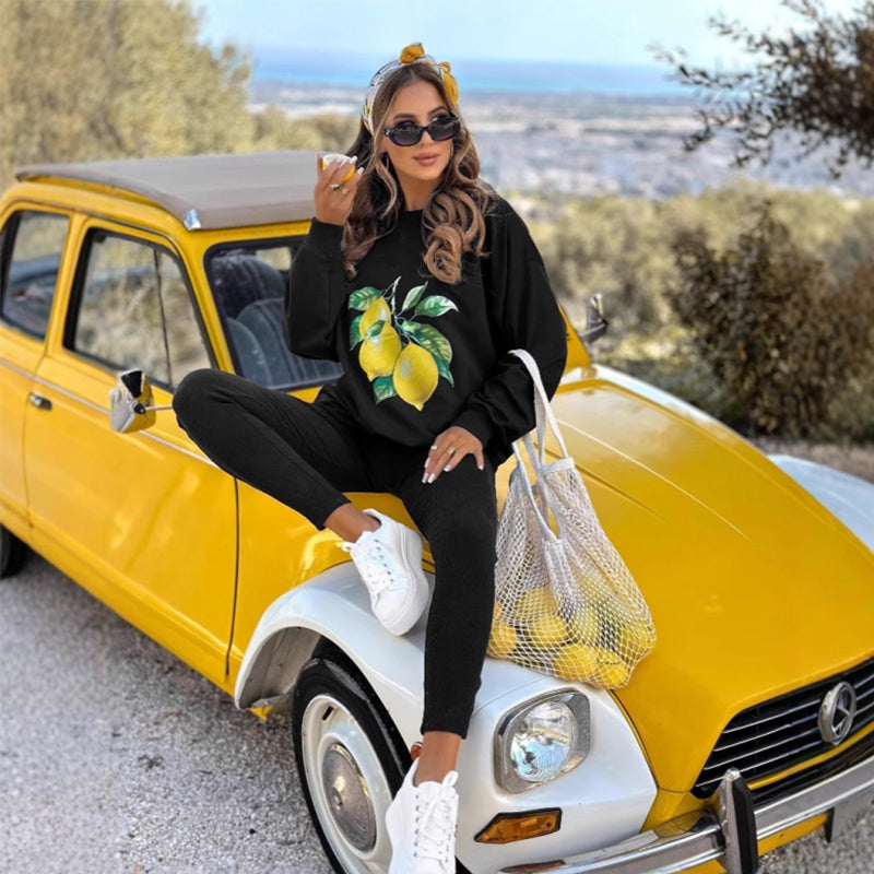 LEMON & LEAF PRINT DESIGN: The casual sweatshirt features a vibrant lemon and green leaf print that radiates a fresh, summery vibe. This eye-catching design blends playful charm with artistic flair, making the set stand out in any wardrobe.