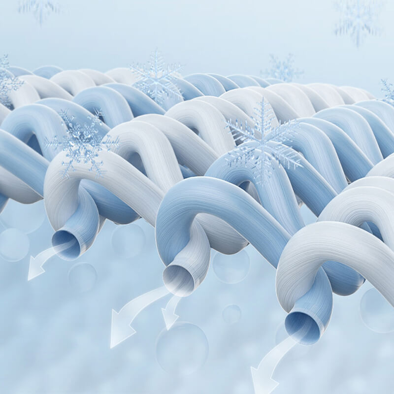 Lightweight cooling fiber, processed by various processes, infused with high-stability cooling particles, provides a full range of long-lasting sun protection for the skin, and feels cool and refreshing at the moment of contact.