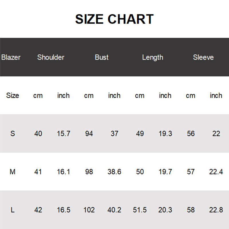 LAPEL DESIGN: The chic lapel detail adds a touch of elegance to the blazer, making it suitable for various occasions. It enhances the overall aesthetic while providing a sophisticated finish.