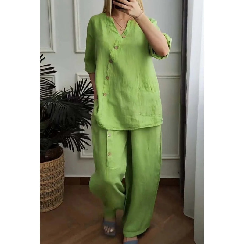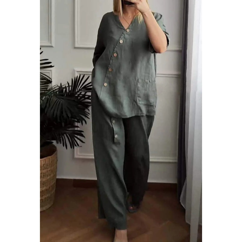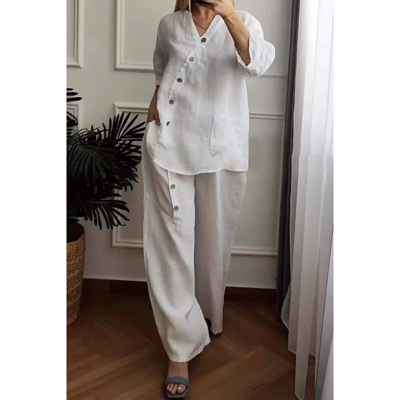 FASHIONABLE & CHIC: Stand out with a V-neck mid-sleeve top and wide-leg pants both featuring distinctive irregular button embellishments.