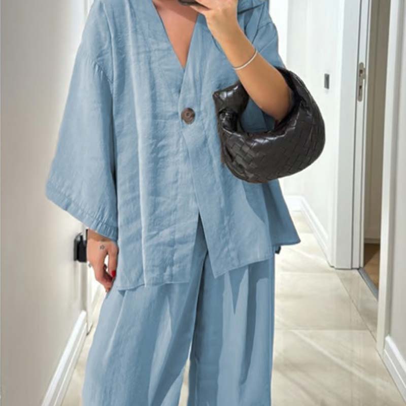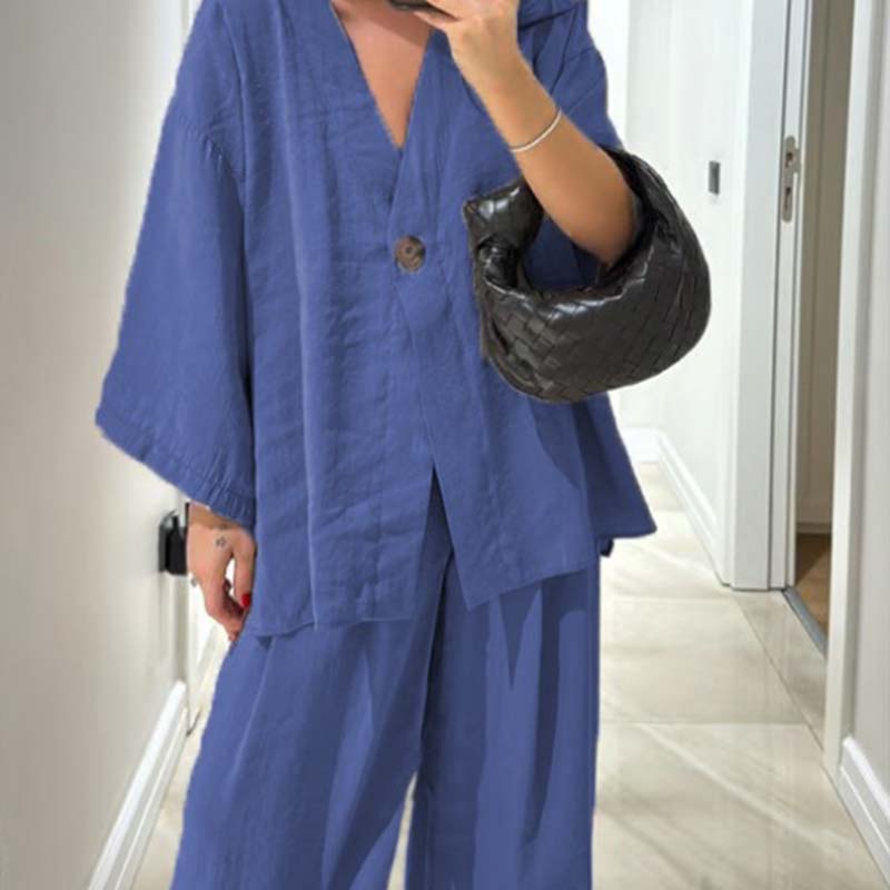 🛍️Fashionable sets at half price🎉Women's V-Neck Top & Wide-Leg Pants Solid Color 2-Piece Set