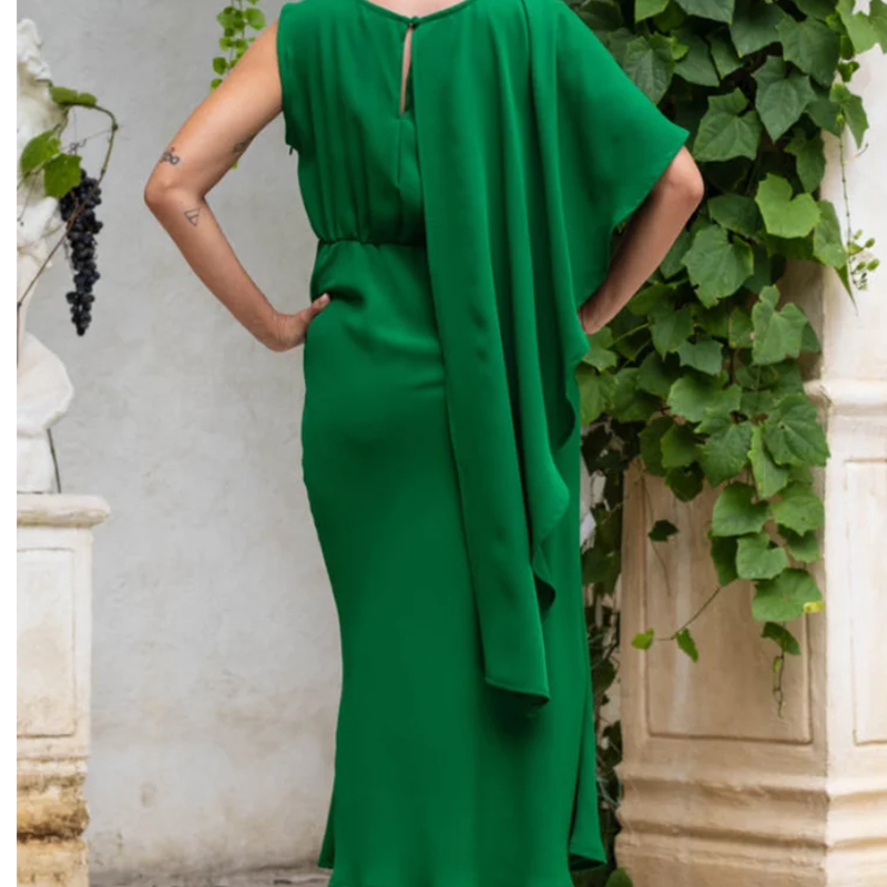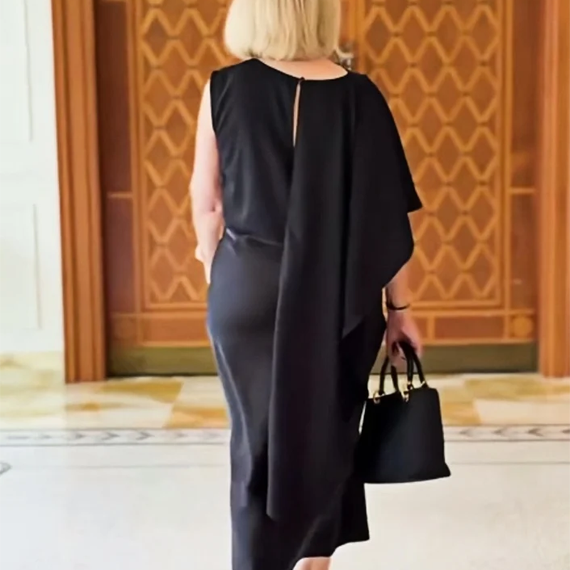 DRAPED PANEL WITH BACK CONNECTION – A flowing fabric panel extends from the front of the sleeveless side and wraps to the back, creating a smooth, layered shape. This design adds a light trailing detail that moves with you, giving the dress a graceful, elegant finish.