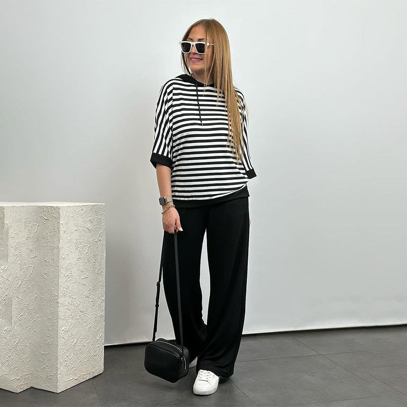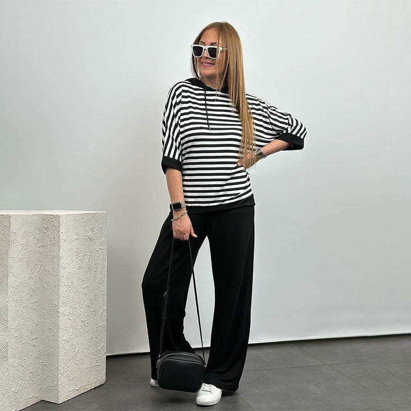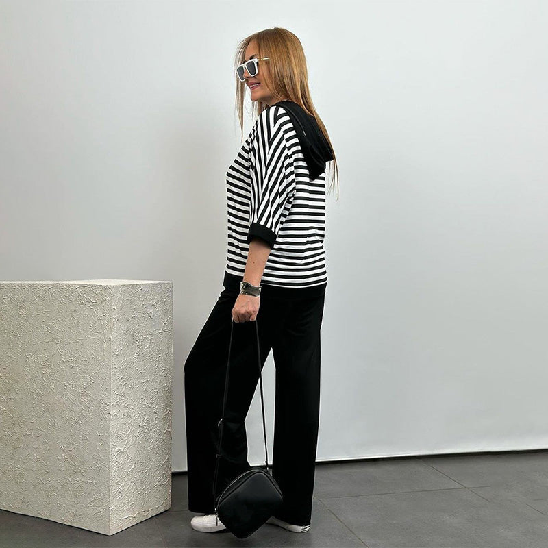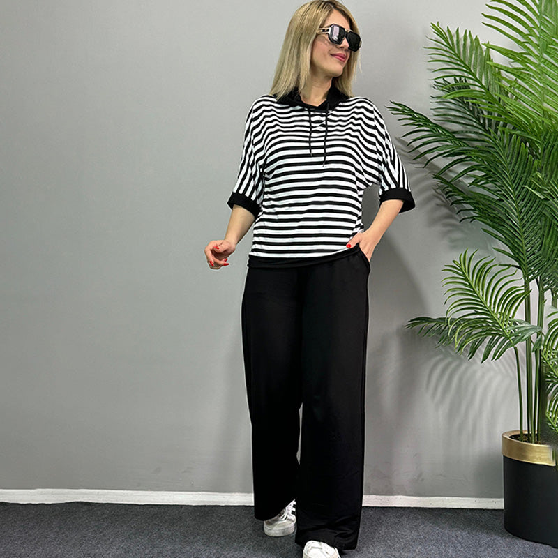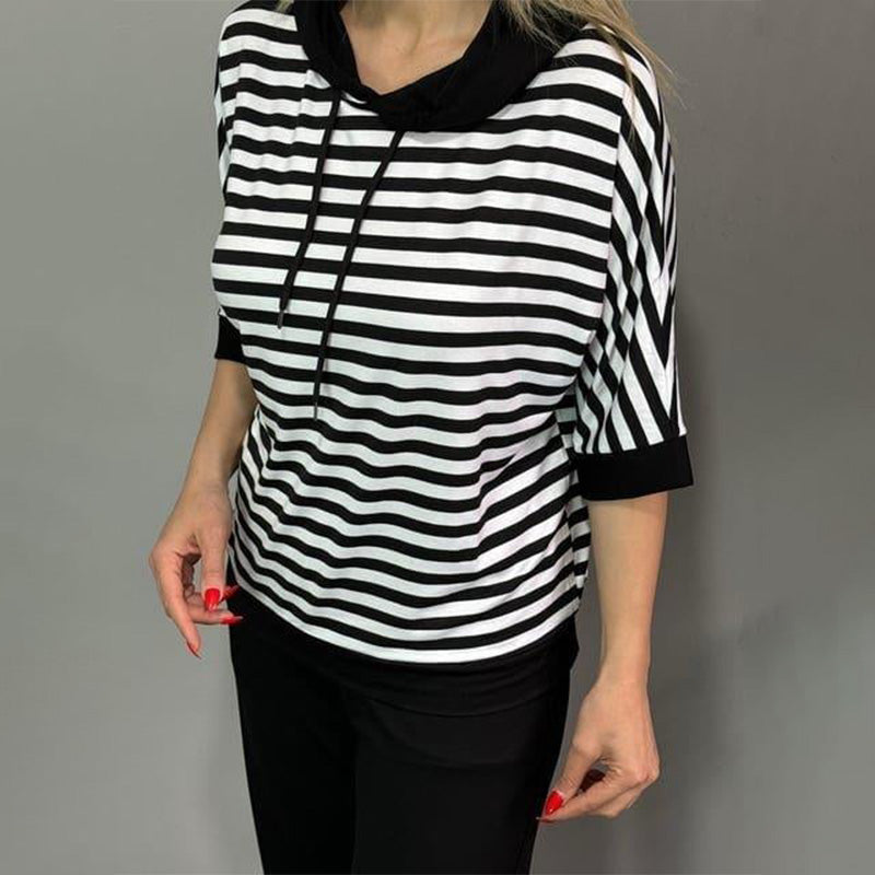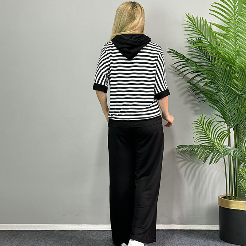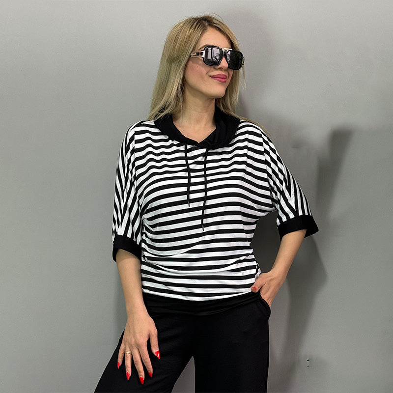 STRIPED HOODED TOP - This eye-catching striped hooded top blends athletic and fashion elements. The lightweight fabric and drawstring hood design offer comfort and coverage, making it suitable for layering or wearing alone as casual wear.