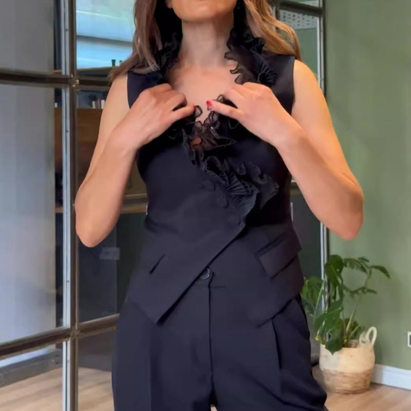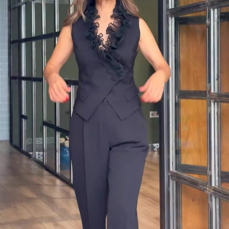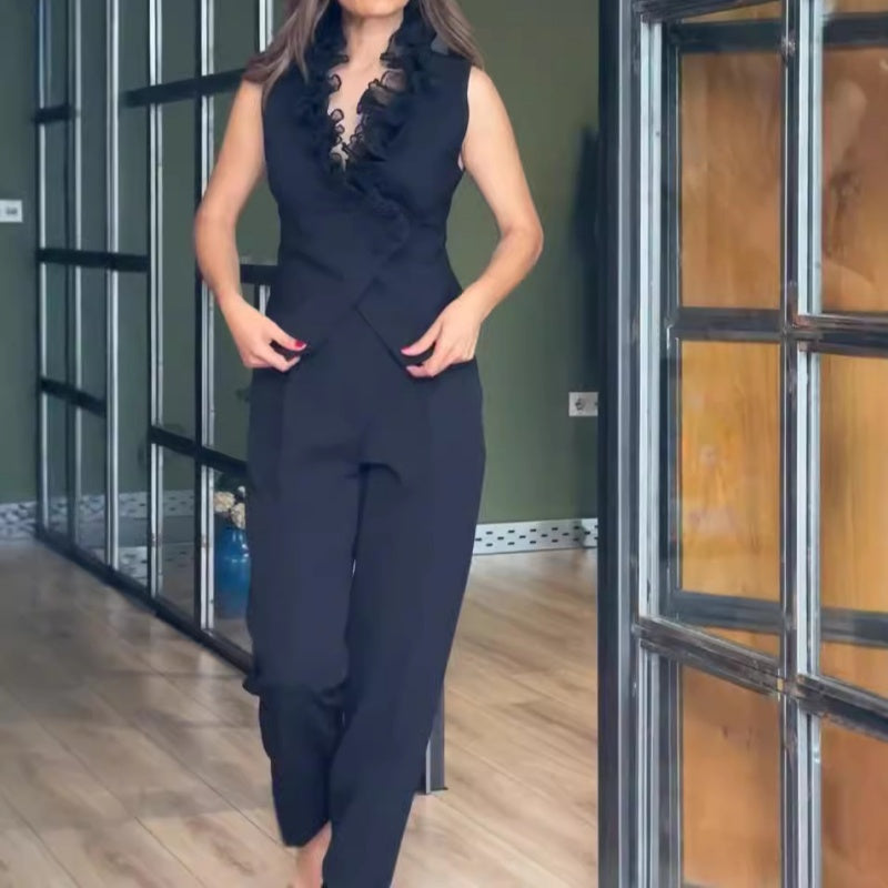 ELEGANT DESIGN - Features a sophisticated black two-piece set with a sleeveless top and matching pants, offering a timeless and chic look suitable for a variety of occasions.